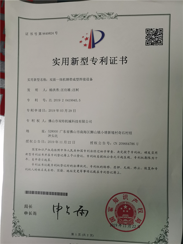 雙特制管機(jī)專(zhuān)利證書(shū)